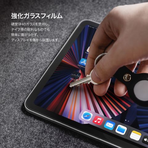 硬度9Hのガラスを使用し、ナイフ等の鋭利なものでも簡単に傷がつかず、ディスプレイを傷から保護します。