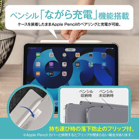装着したままApplePencilProを充電できます。落下防止のフリップ付きデザインです。