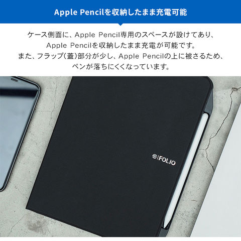 ケース側面に、Apple Pencil専用のスペースが設けてあり、Apple Pencilを収納したまま充電が可能です。また、フラップ(蓋)部分が少し、Apple Pencilの上に被さるため、ペンが落ちにくくなっています。