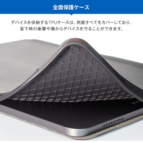 デバイスを収納するTPUケースは、側面すべてをカバーしており、落下時の衝撃や傷からデバイスを守ることができます。
