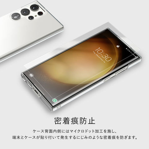 ケース背面内側にはマイクロドット加工を施し、端末とケースが貼り付いて発生するにじみのような密着痕を防ぎます。