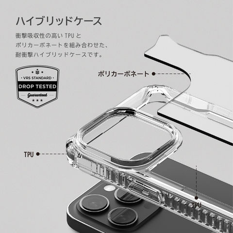 衝撃吸収性の高いTPUとポリカーボネートを組み合わせた、耐衝撃ハイブリッドケースです。