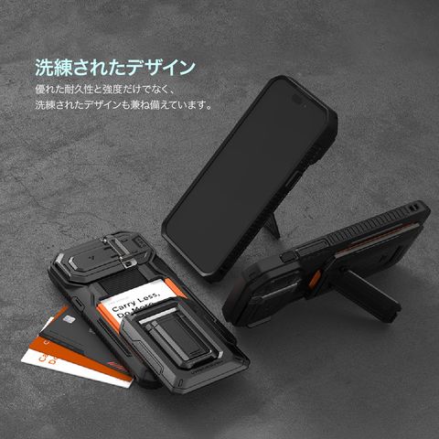 背面にスライド式カードホルダーとスタンドを搭載しています。カードは3枚まで収納可能です。
