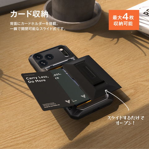 背面にカードホルダーを搭載したケースです。独自技術を使用し、スライド式でスムーズに開閉が可能です。