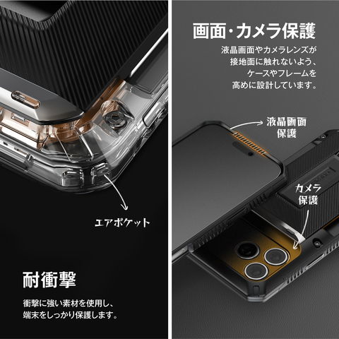 デバイスを装着した状態で、あらゆる角度から落下させる独自のテストをパスした、衝撃に強いケースです。