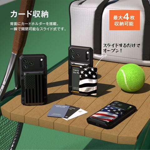 背面にカードホルダーを搭載したケースです。独自技術を使用し、スライド式でスムーズに開閉が可能です。