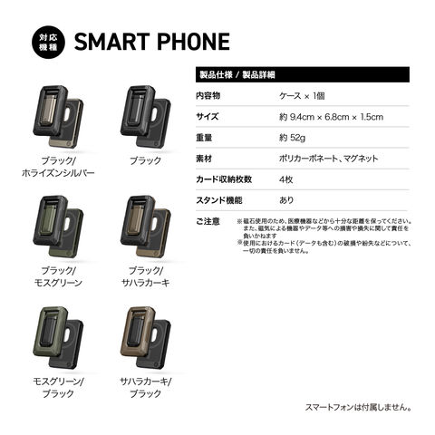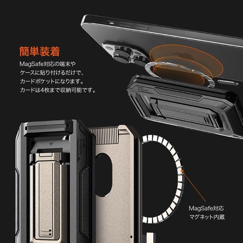 MagSafe対応の端末やケースに貼り付けるだけで、カードポケットになります。カードは4枚まで収納可能です。