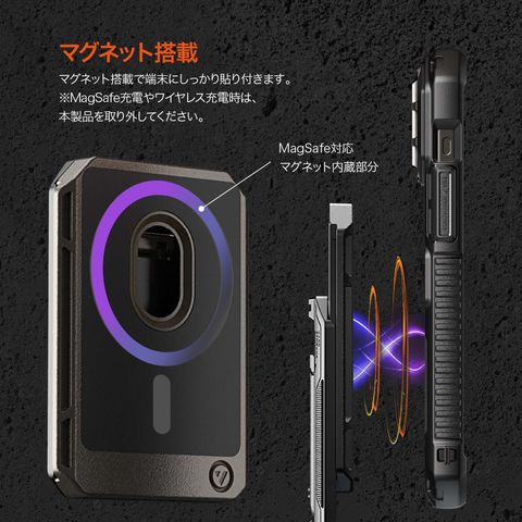 マグネット搭載で端末にしっかり貼り付きます。※MagSafe充電やワイヤレス充電時は、本製品を取り外してください。
