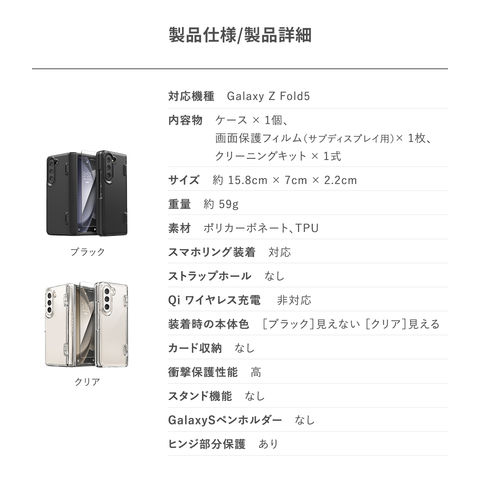 ケース × 1個、画面保護フィルム(サブディスプレイ用) × 1枚、クリーニングキット × 1式