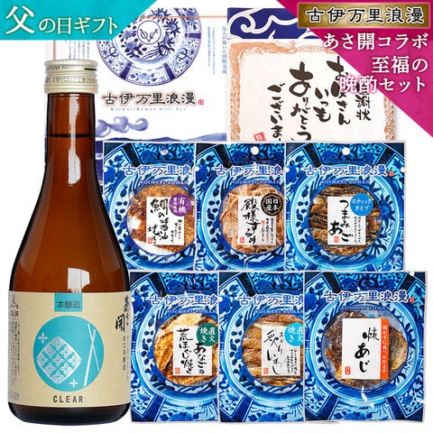 おつまみ お酒 ギフト あさ開(本醸造)とおつまみ6選 古伊万里浪漫 お歳暮 送料無料 【お父さん感謝状のし付】 常温 セット 日本酒 プレゼント 詰め合わせ 食品 珍味 海鮮 魚 干物 酒 つまみ お菓子 父 誕生日 クリスマス 御歳暮 冬ギフト 還暦祝い 内祝い いか あご いわし