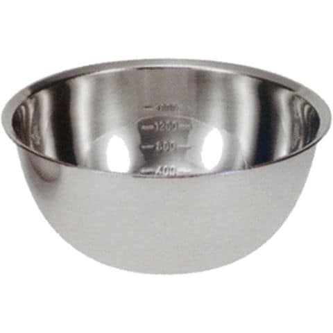 中の材料がこぼれにくく、まぜやすい深型タイプ。便利な目盛付。(400/800/1200/1600)。同じサイズのパンチングボウルと重ねて使えます。