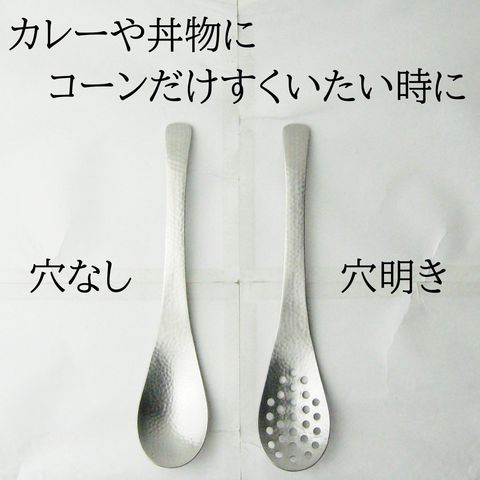 穴無しは丼ものやカレーなどの食事用に。穴あきはラーメンなどでコーンや肉味噌などスープだけを落としたい時に。