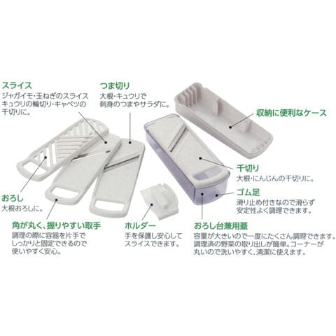 セット内容:おろし器/スライサー/千切り/つま切り/保護ホルダー/収納ケース各1個