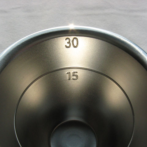 大きなカップは60ml(目盛線 30・45・60ml)、小さなカップは30ml(目盛線 15・30ml)を計量できる。