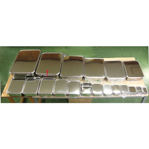 新潟 燕三条にて製造されている18-8ステンレスの深型組バット。 調理中や下ごしらえの時など、調理台の上をすっきりとまとめられて料理の効率も上がる。 トレイとしての機能の他に、別売りの蓋を使用すると保存容器としても使用することができる。 業務用仕様の製品で非常に板厚が厚く、しっかりとしたつくり。 調理台の大きさや用途に応じて19サイズ展開。 非常に大まかなサイズ区分は、ミニ号からS号までが調味料などの小物。1号から8号までが家庭で使用するサイズ感。9号から16号は業務用や調理以外の特殊な用途での使用。 本体・蓋が全て単品でも購入できるので、自分の使用スタイルに合ったカスタマイズができる。(セット組みは単品よりもお買い得です) 製造は、業務用ステンレス製厨房用品を手がける株式会社赤川器物製作所。同社の製品を有限会社ナガオがセット組みにて販売している。 *注意事項* 食洗器使用可・電子レンジ使用不可。 企業ごみ削減のため商品外装は袋入れのみとなる。 取り扱い説明書等は付属しておりません。商品説明をご確認下さいませ。