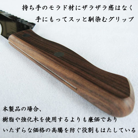 持ち手のモラド材にザラザラ感はなく、手にもってスッと馴染むグリップ。本製品の場合、樹脂や強化木を使用するよりも廉価であり、いたずらな価格の高騰を防ぐ役割もはたしている。