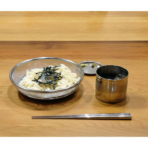 そばちょこはステンレス製であることによって、つけつゆがキンキンに冷えてそば・うどん・そうめんがより美味しくいただけるようになる。様々な薬味で味変を楽しめるように薬味皿もついている。