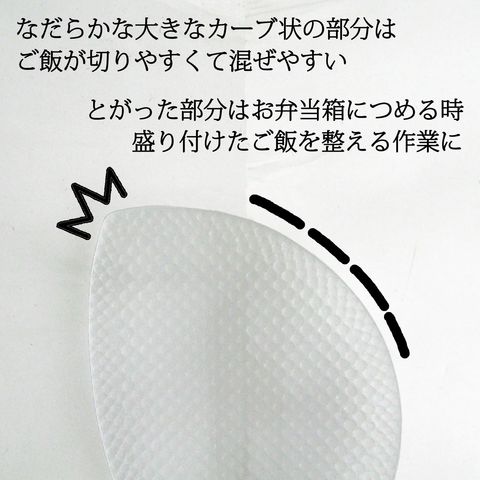 左右非対称で利き手専用設計でつくられており、なだらかな大きなカーブ状の部分はご飯が切りやすくて混ぜやすい。ご飯の【切れ味】は心地よくよそうための大きな要素です。