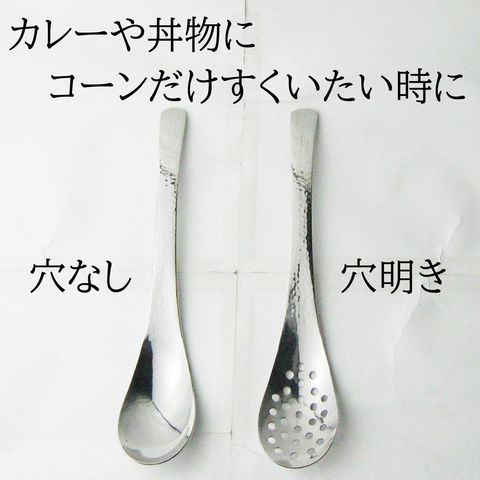 穴無しは丼ものやカレーなどの食事用に。穴あきはラーメンなどでコーンや肉味噌などスープだけを落としたい時に。