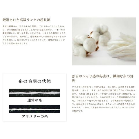 素材は厳選された天然のものを使用。 アサメリーのもとになるのは、1本の繊維が細くて長く、しなやかな超長綿です。 一本一本の繊維が細いと、細い糸を引くことができ、しなやかな製品をつくることができます。 肌が弱く、化学繊維の入った肌着を着用できない方にも優しく、綿100%でつくられたアサメリーは触れてほっとするような安らぎがあります。