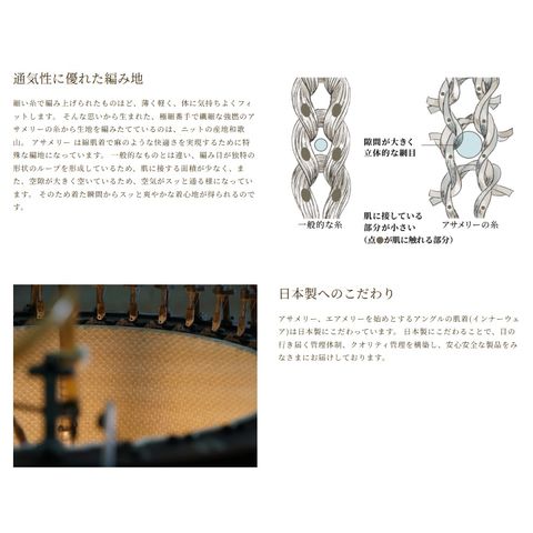 細い糸で編み上げられたものほど、薄く軽く、体に気持ちよくフィットします。 そんな思いから生まれた、極細番手で繊細な強撚のアサメリーの糸から生地を編みたてているのは、ニットの産地和歌山。 アサメリー は綿肌着で麻のような快適さを実現するために特殊な編地になっています。 一般的なものとは違い、編み目が独特の形状のループを形成しているため、肌に接する面積が少なく、また、空隙が大きく空いているため、空気がスッと通る様になっています。 そのため着た瞬間からスッと爽やかな着心地が得られるのです。