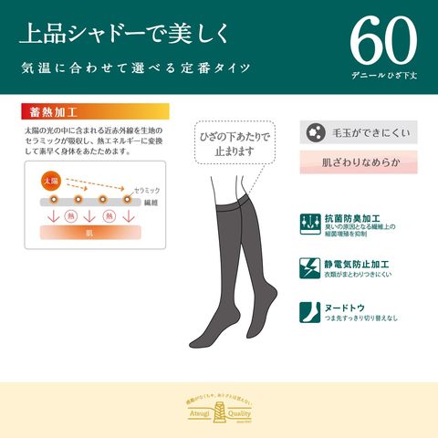 アツギ タイツ 膝下 60デニール 2足組 光発熱加工 静電気防止加工 抗菌防臭 ATSUGI FP80622P