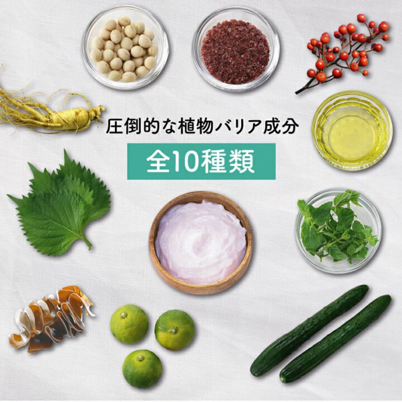 水、セタノール、グリセリン、プロパンジオール、ジメチコン、トリ(カプリル酸/カプリン酸)グリセリル、ステアリン酸グリセリル(SE)、ステアリン酸、セテアリルアルコール、カプリン酸グリセリル、シア脂、スクワラン、ホホバ種子油、トコフェロール、セイヨウハッカ葉エキス、オタネニンジン根エキス、キュウリ果実エキス、シソ葉エキス、ダイズ種子エキス、ユズ果実エキス、アスコフィルムノドスム/ヒバマタ/ヒジキ/トロロコンブ/レソニアニグレスセンス/ミツイシコンブ/リシリコンブ/ワカメエキス、ヒアルロン酸Na、水溶性コラーゲン、シアノコバラミン、カニナバラ果実油、グリチルリチン酸2K、テトラヘキシルデカン酸アスコルビル、加水分解卵殻膜、塩化Na、キサンタンガム、セテス-2、セテアリルグルコシド、PPG-6デシルテトラデセス-30、ラウリン酸ポリグリセリル-2、ラウリン酸ポリグリセリル-10、エタノール、BG、カプリリルグリコール、1,2-ヘキサンジオール、ジメチロールプロピオン酸ヘキシル、ペンチレングリコール