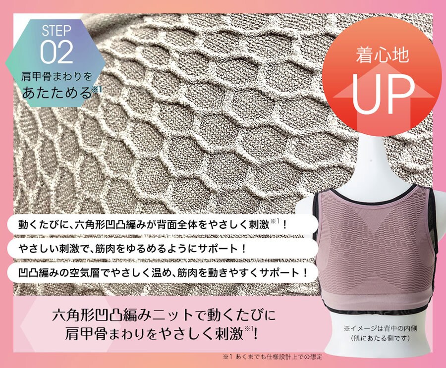 クロス構造で肩甲骨まわりを引き寄せ、六角形凹凸編みで肩甲骨まわりの筋肉をゆるめる。