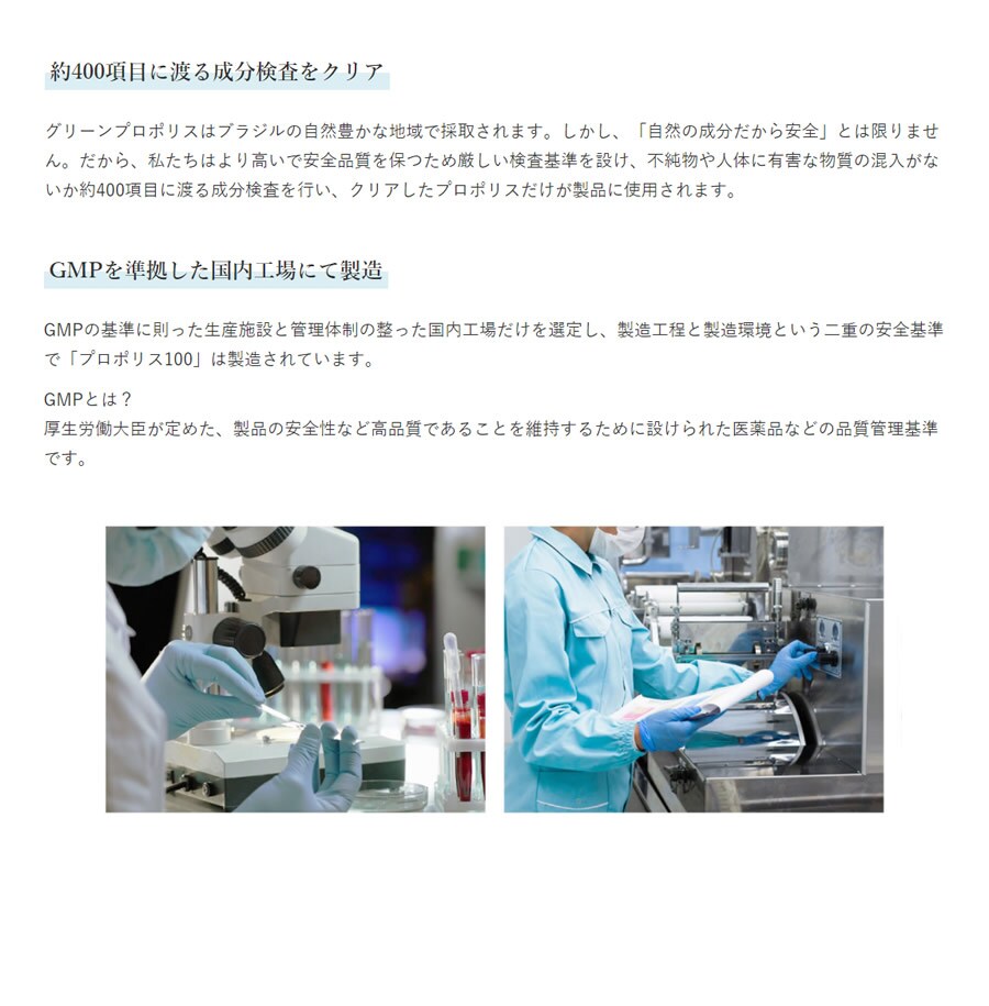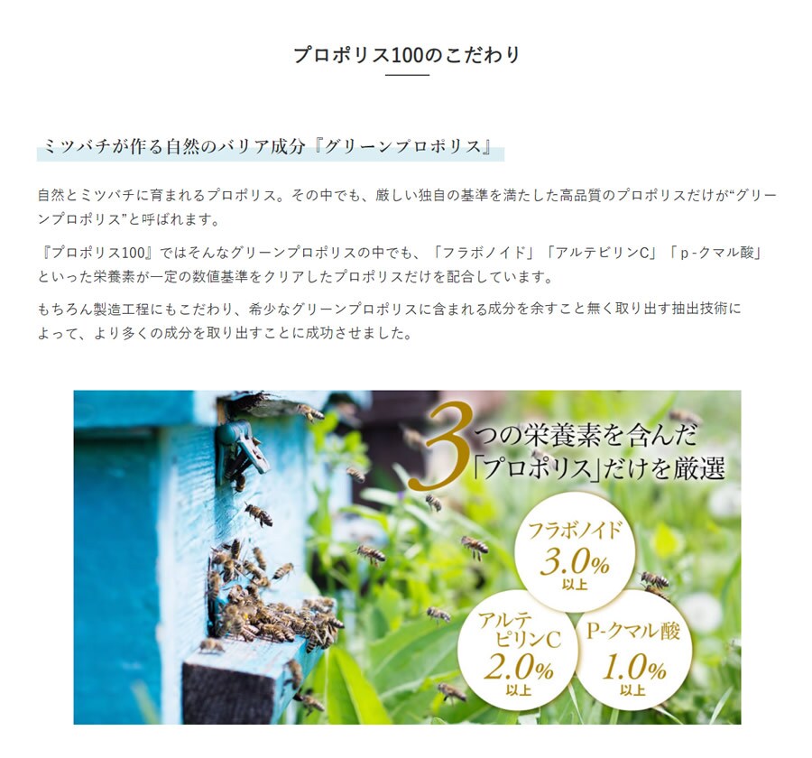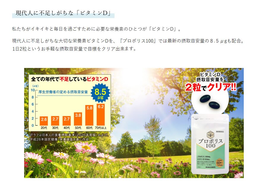 『プロポリス100』ではそれに加え、現代人に不足しがちな大切な栄養素『ビタミンD』を8.5μg配合。