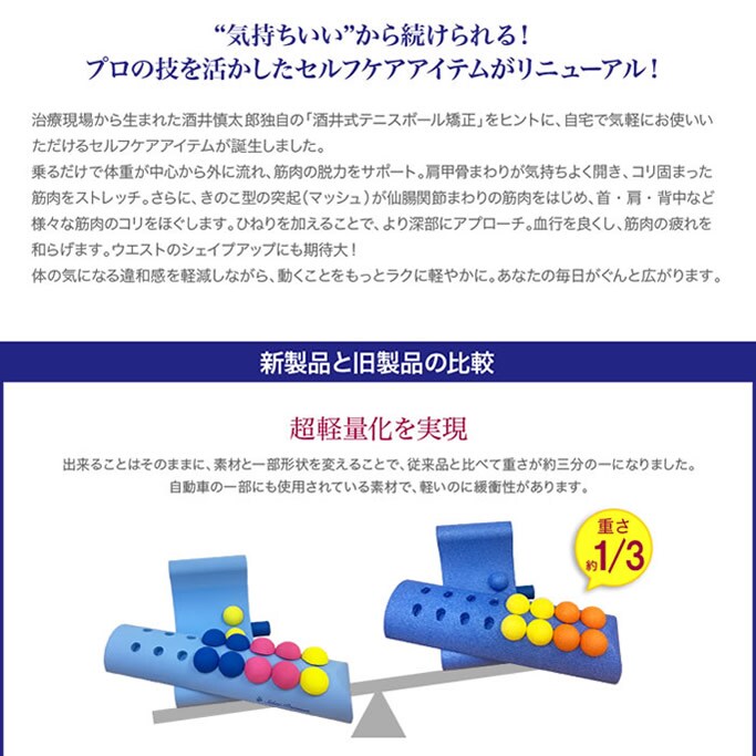 治療現場から生まれた酒井慎太郎独自の「酒井式テニスボール矯正」をヒントに、自宅で気軽にお使いいただけるセルフケアア イテムが誕生しました。