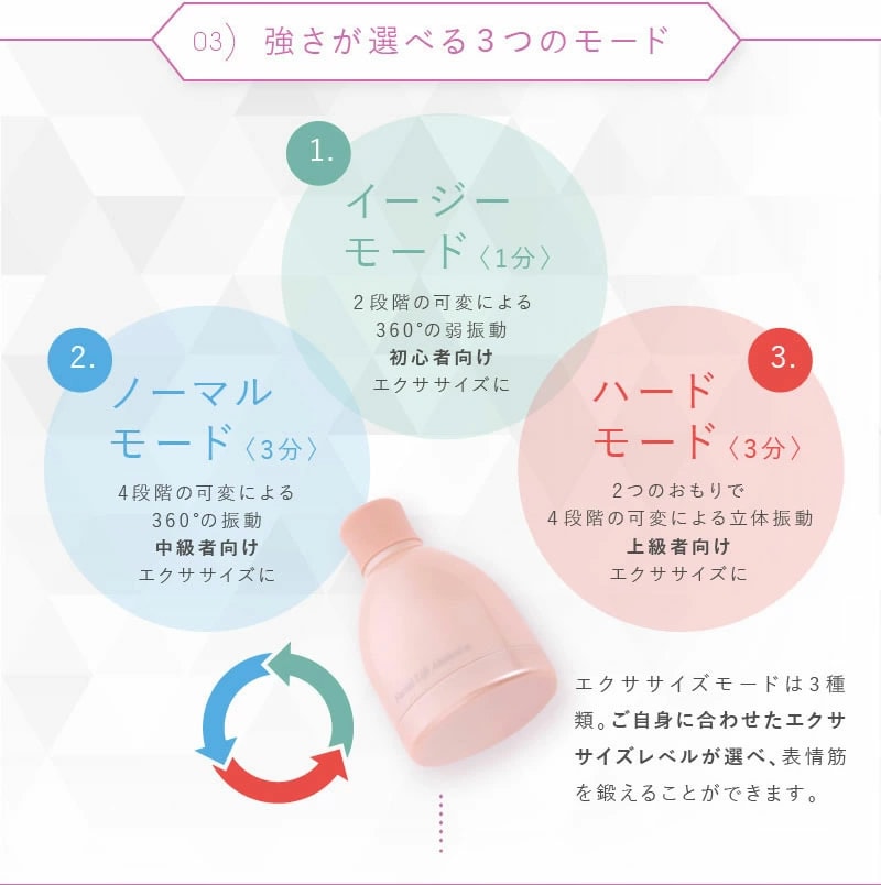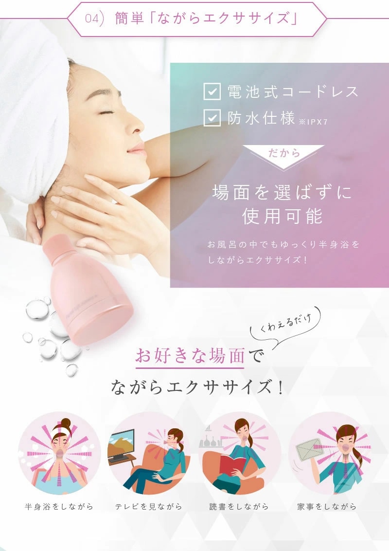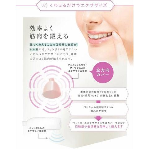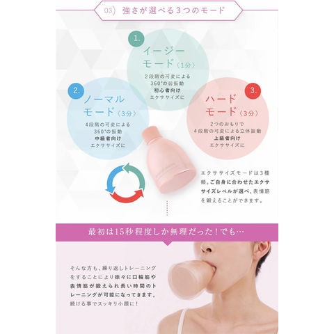 縦横2つのおもりを強弱4段階で360°前後左右に振り回まわすような遠心力を発生させてペットボトルダイエットでは鍛えられない表情筋や口輪筋にアプローチ。