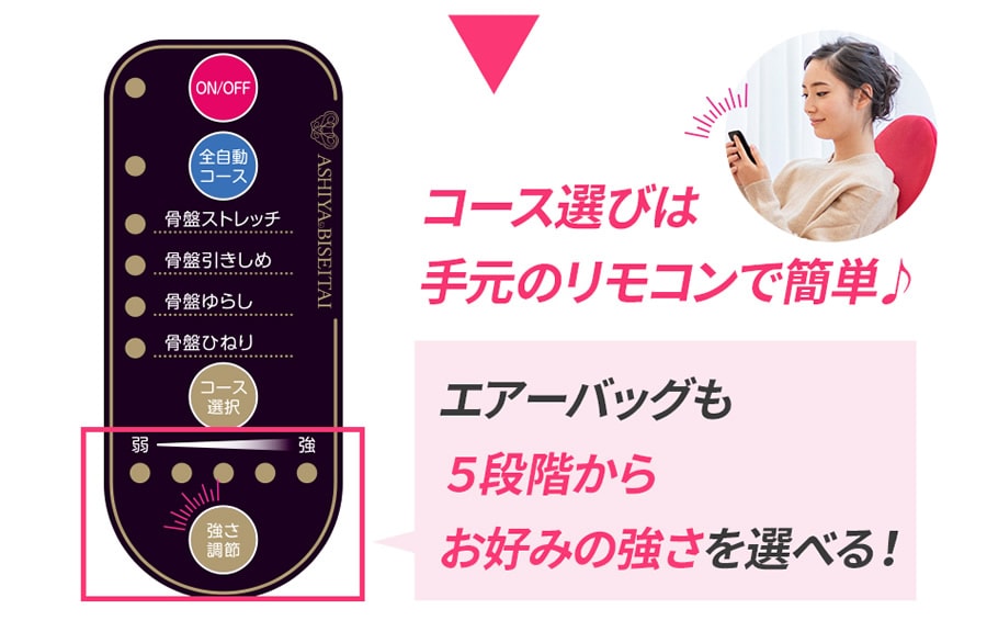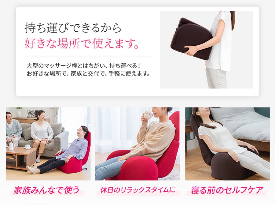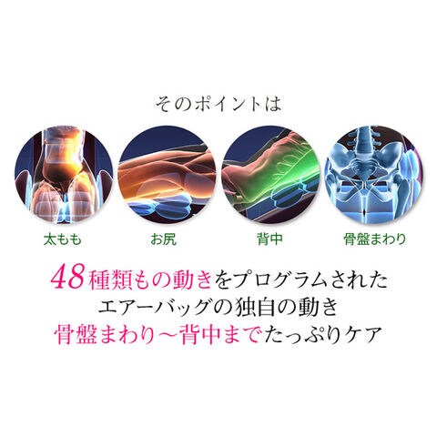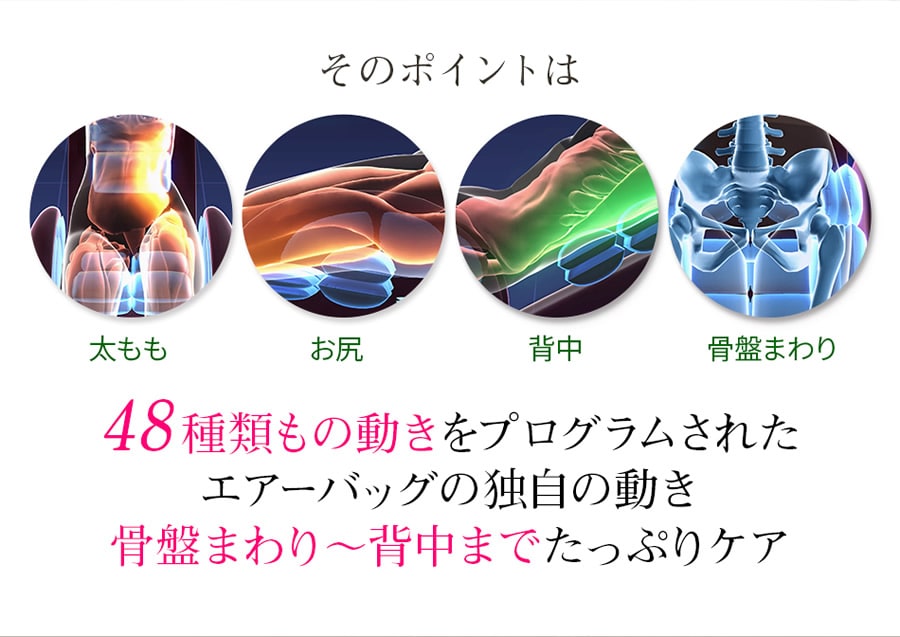座面や側面、背面に計24枚のエアーバッグを配置し、素早く多彩な動きで背中から腰、そして骨盤まわりまでアプローチします。