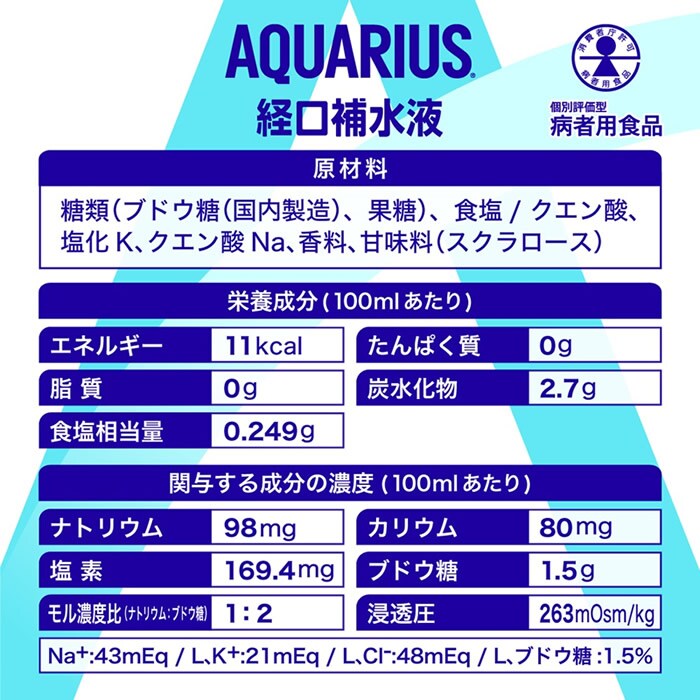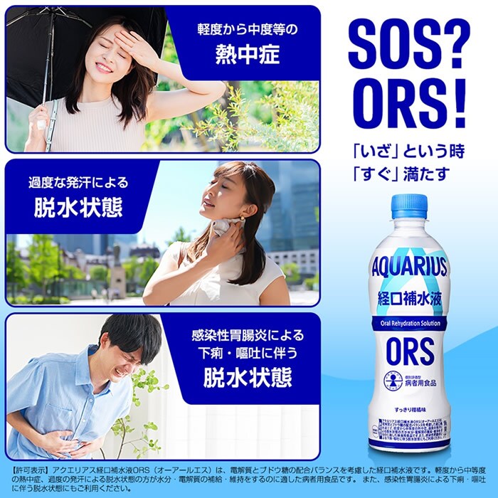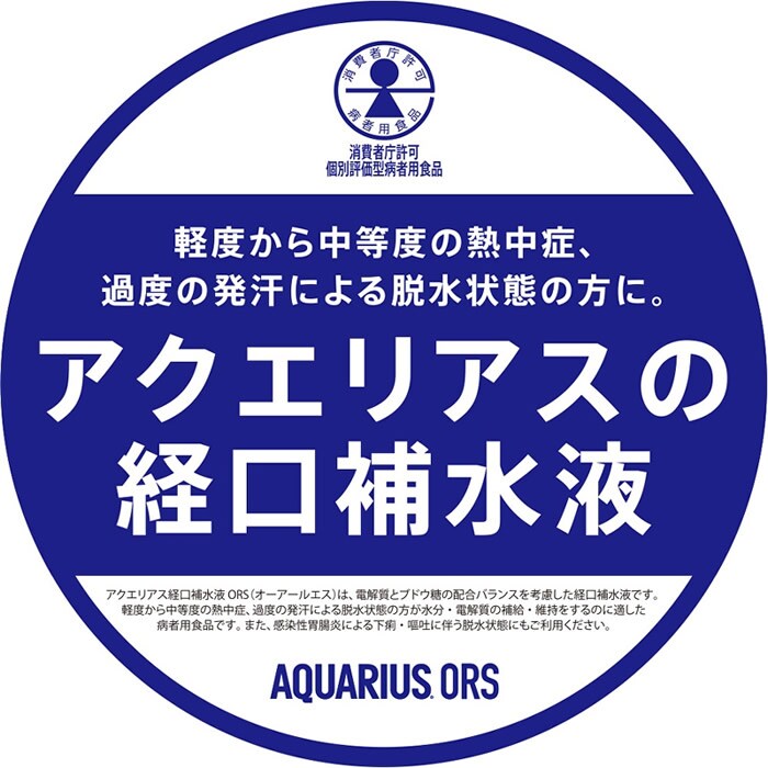 アクエリアス経口補水液ORS(オーアールエス)は、電解質とブドウ糖の配合バランスを考慮した経口補水液です。
