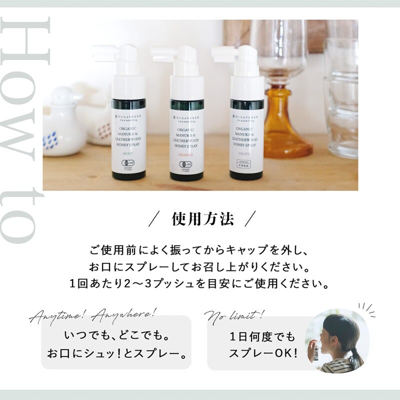 ご使用前によく振ってからキャップを外し、お口にスプレーしてお召し上がりください。