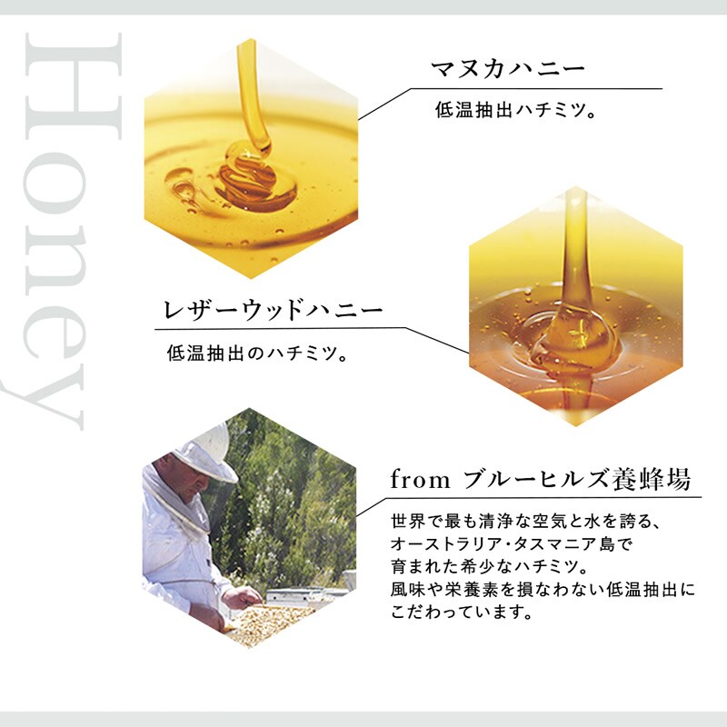 マヌカハニー、レザーウッドハニーとカミツレエキスをキー成分に、効果を追求して厳選された植物成分をブレンドしました。
