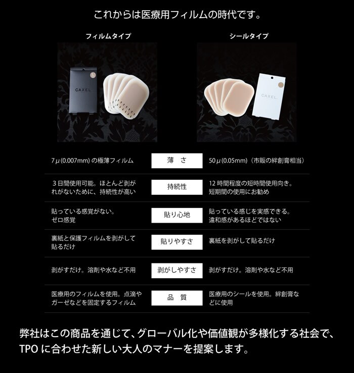 生地の素材はフィルムタイプ同様、医療用シールを使用し開発しました。お肌にも安心・安全の日本製です。
