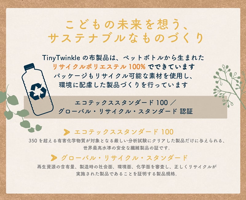 (リサイクルポリエステルを100%使用。エコテックススタンダード100認証済。)