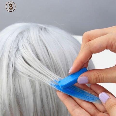 2.ヘアチョークを毛流れに沿って上から下へこすりつけるようにして着色していきます。(はっきりと発色させたい時はお好みの色になるまでチョークを塗り重ねてください。)