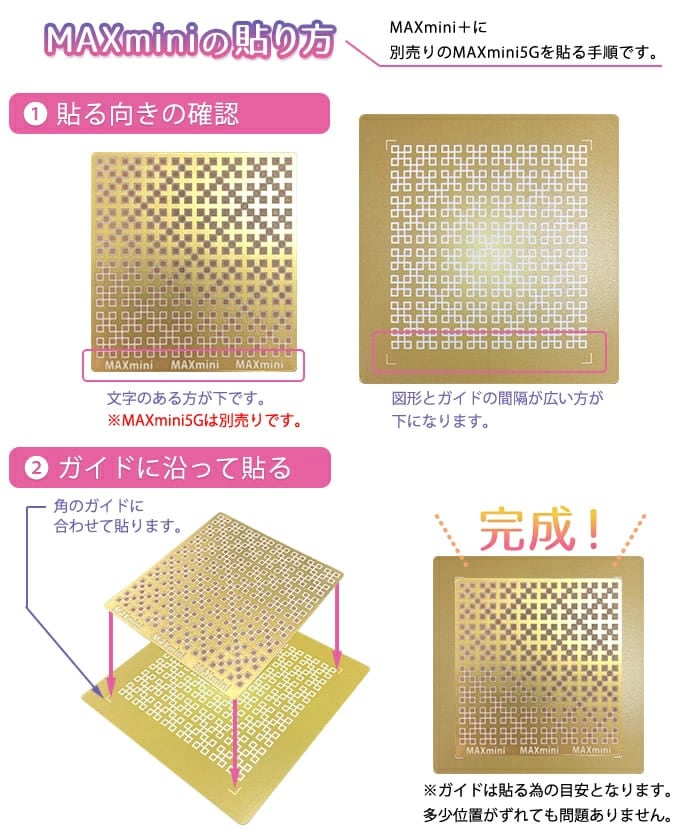 ●MAXmini 5Gを既に貼り付けている場合で、併用したい場合は、MAXmini 5Gの上からMAXmini +を貼るか、使用中のMAXmini 5Gの近くにMAXmini +を並べて貼ってください。
