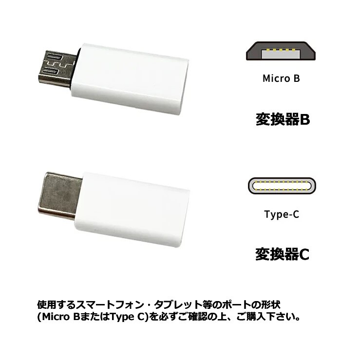 使用するスマートフォン・タブレット等のポートの形状(Micro BまたはType C)を必ずご確認下さい。