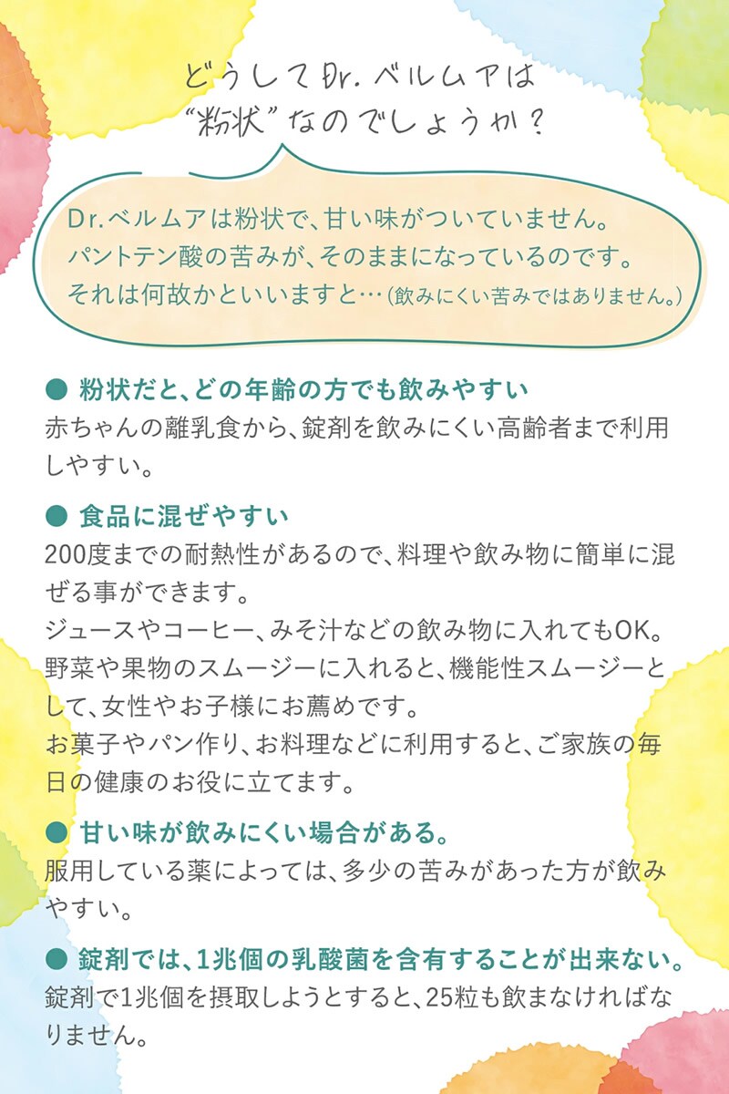 ●口内の健康のために、市販の歯磨き粉の中にDr.ベルムアを1~2包入れて、「乳酸菌入り歯磨き粉」としてもお使いいただけます。