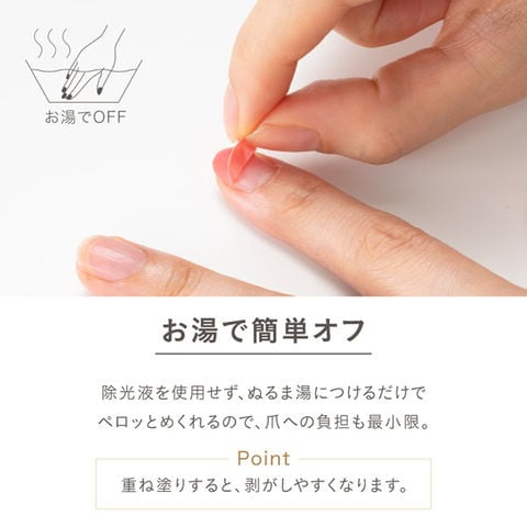 お湯でペロリと剥がせるので、除光液で爪を傷める心配もありません。