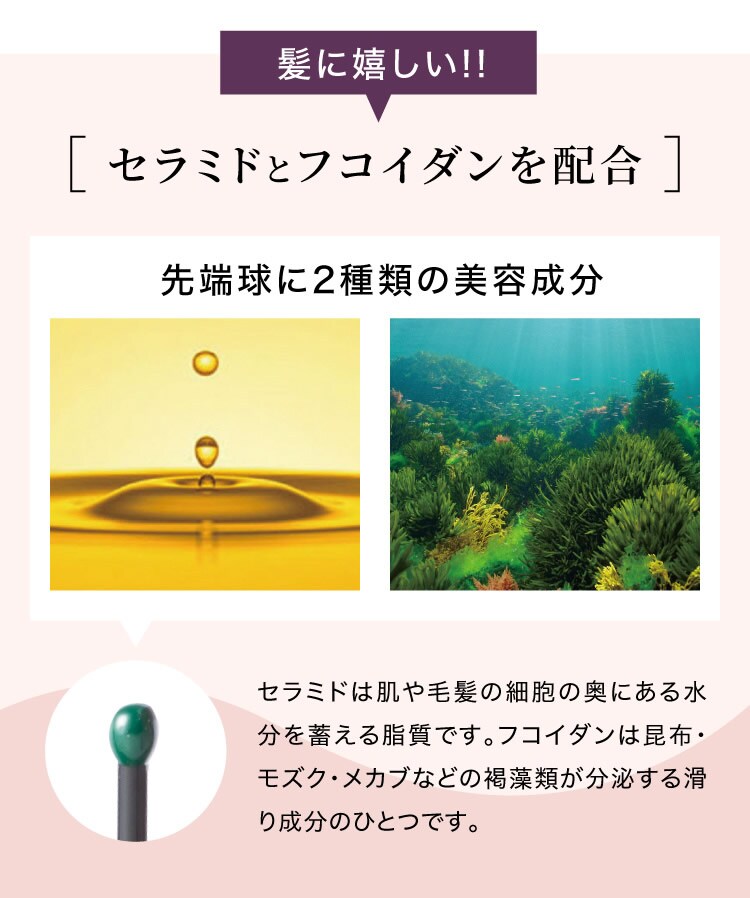 ブラシ自体はナイロンピンと天然毛(豚毛)の混合植毛となっており、ナイロンの先にはセラミドとフコイダン成分がマイクロカプセルとなり配合されております。