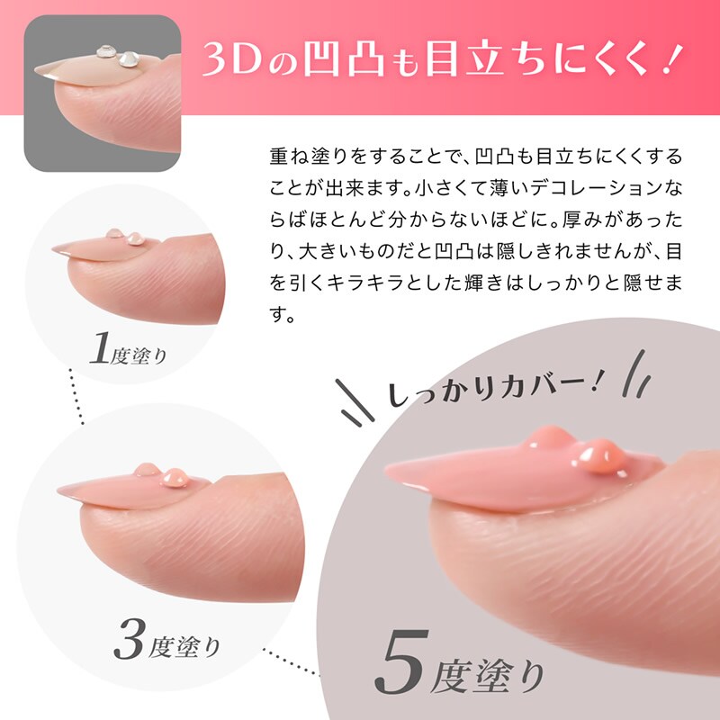 また、日頃からおしゃれなネイルをされている方も、急なお通夜や面談などの急なフォーマルな場面で1日だけネイルを隠したい時にもデコネイル等の上に重ね塗りすることで、ネイル隠しとしても使用できます。