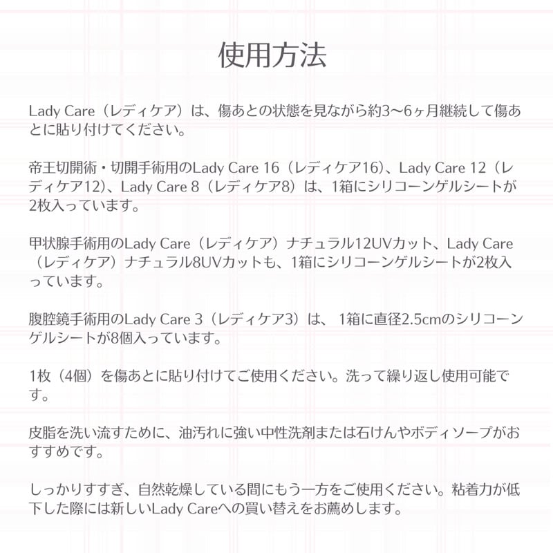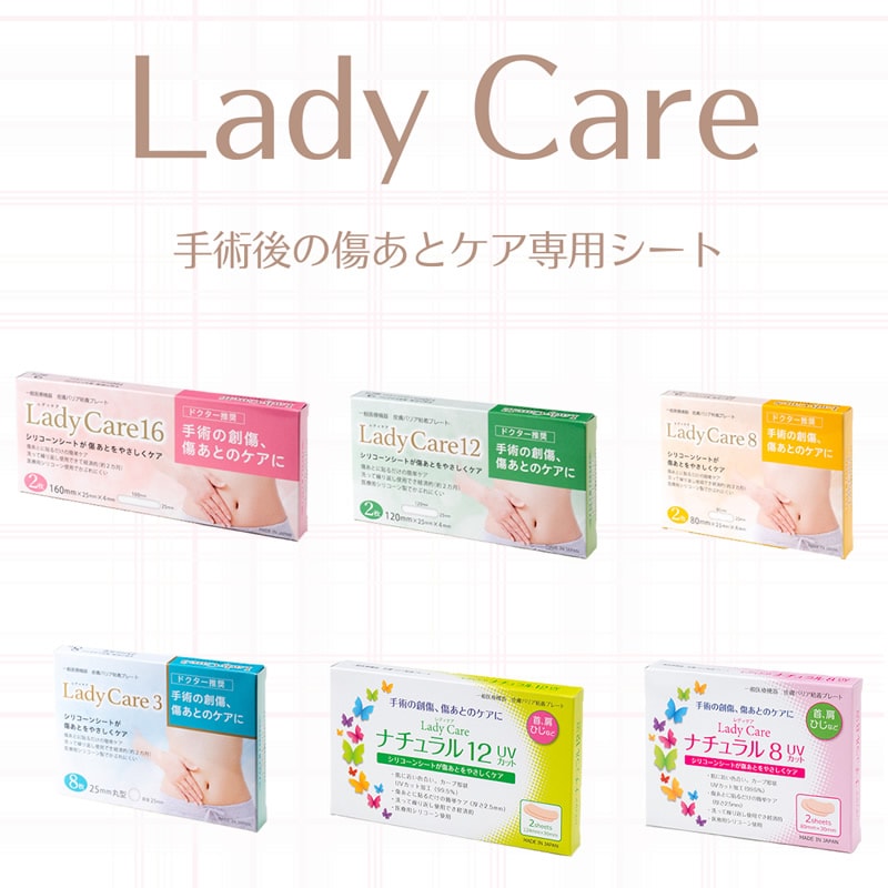 Lady Care(レディケア)は帝王切開・開胸・開腹手術などの切開手術、腹腔鏡手術の創傷の保護、皮膚の異常な盛り上がり(肥厚性瘢痕・ケロイド)の予防を目的として開発されたシリコーンゲルシートです。
