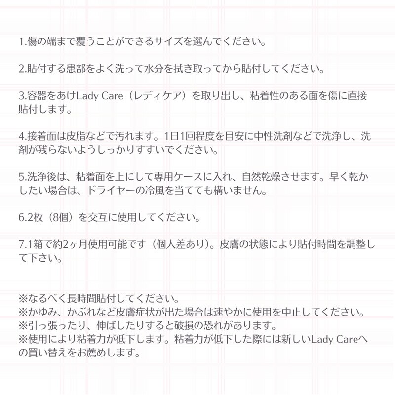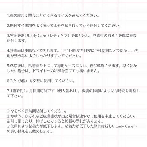 Lady Care(レディケア)は、傷あとの状態を見ながら約3~6ヶ月継続して傷あとに貼り付けてください。