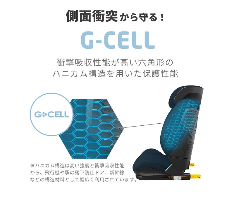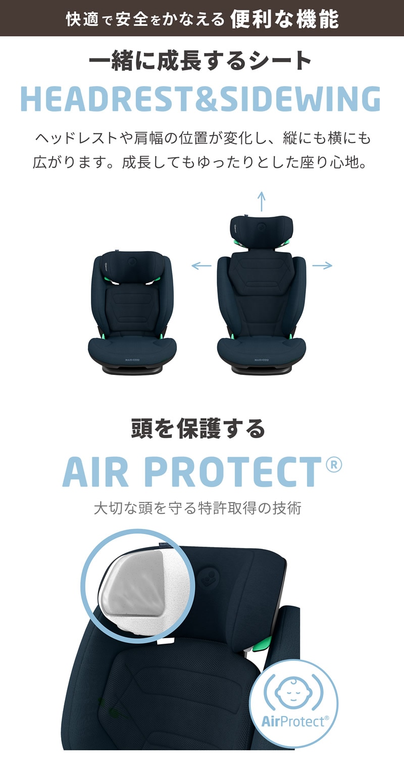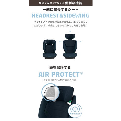 お子さまの成長に合わせて最大20cmまで高さ調整が可能なヘッドレストに加えて、肩幅をワイドに調整できるサイドウイングにより、成長しても変わらないゆったりとした座り心地を維持します。