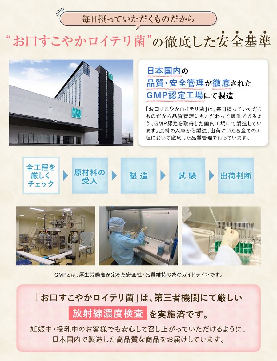 ロイテリ菌が生きたまま腸まで届くなどWHO/FAOのプロバイオティクス基準に準拠。