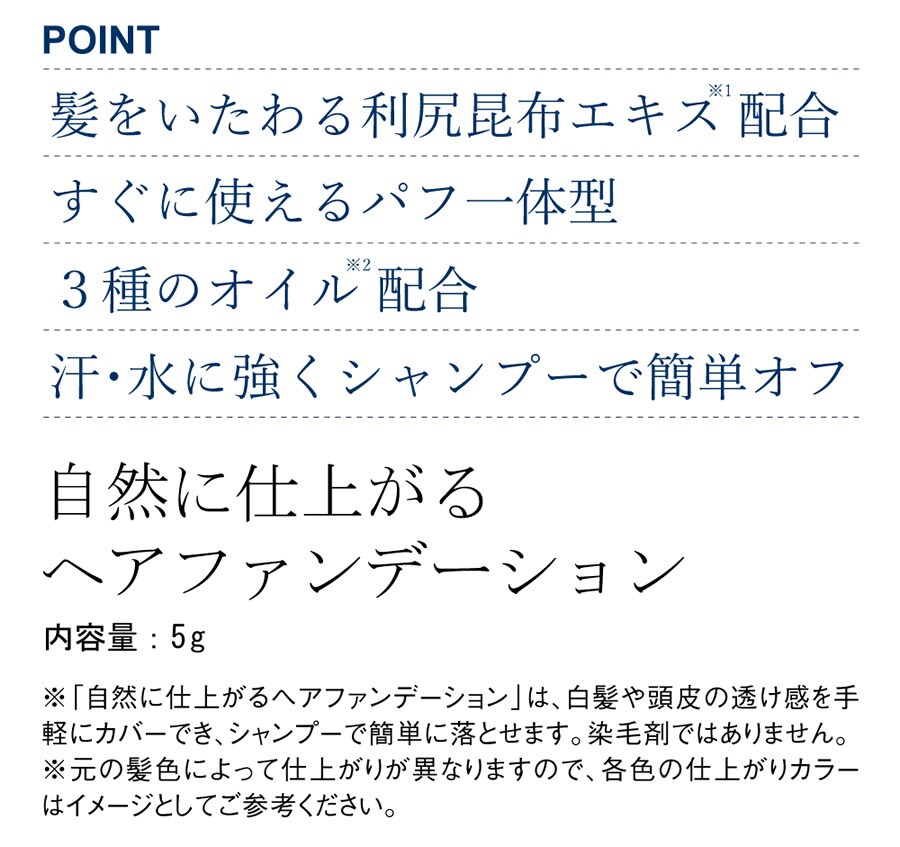 手軽に気になるポイントをカバーしてくれる、リシリコンブエキス配合のヘアファンデーション。