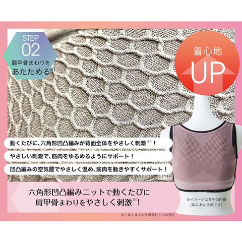 クロス構造で肩甲骨まわりを引き寄せ、六角形凹凸編みで肩甲骨まわりの筋肉をゆるめる。
